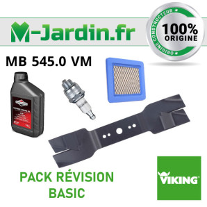 Pack révision tondeuse version basic pour appareil Viking modèle MB 545.0 VM. Contient : une dose d'huile en 0,6L, une bougie RJ19LM, un filtre à air 491588S, une lame...